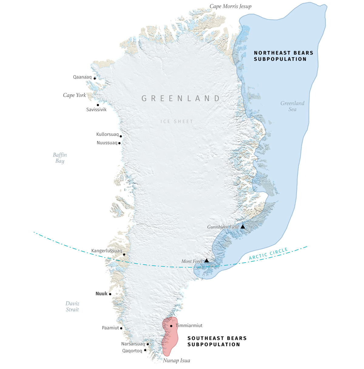 A group of scientists from the University of Washington and the National Snow Ice and Data Center, followed bears in Southeast Greenland for seven years and after a genetic analysis they discovered that polar bears in the south are a distinct subpopulation that has adapted to survive with less sea ice. Below is a map showing their habitad areas based in info provided by NASA's Earth Observatory.