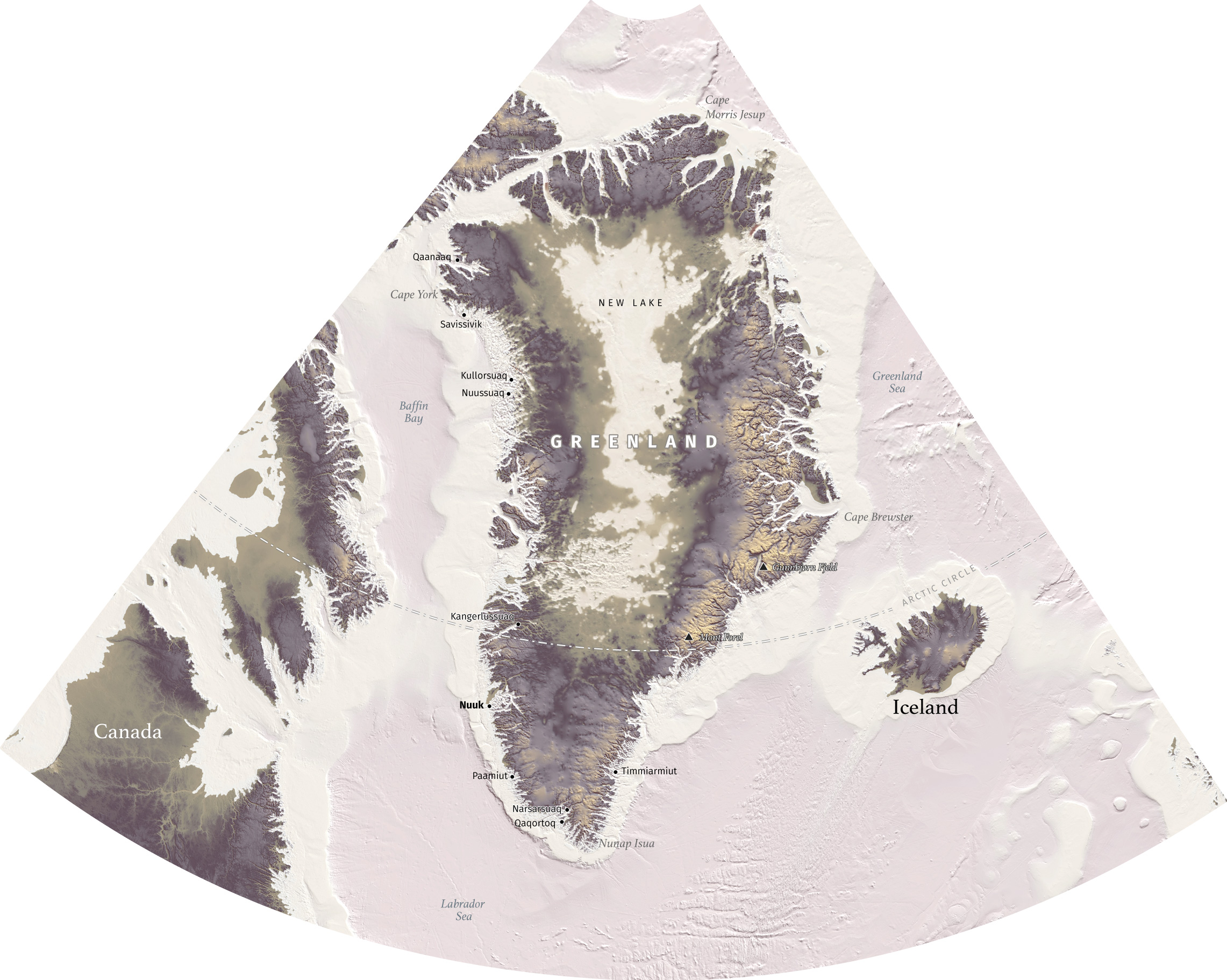 That, of course, makes me wonder what Greenland would look like without that enormous ice sheet. GEBCO offers global bathymetry data, and when I downloaded the sub-ice data for the area of Greenland I found that most of the interior of the island is under the sea level. Without the ice connecting the land, Greenland would look like a cluster of large islands rather than a single landmass, with jagged coastlines and deep fjords. Below you can see a map of Greenland with no ice.