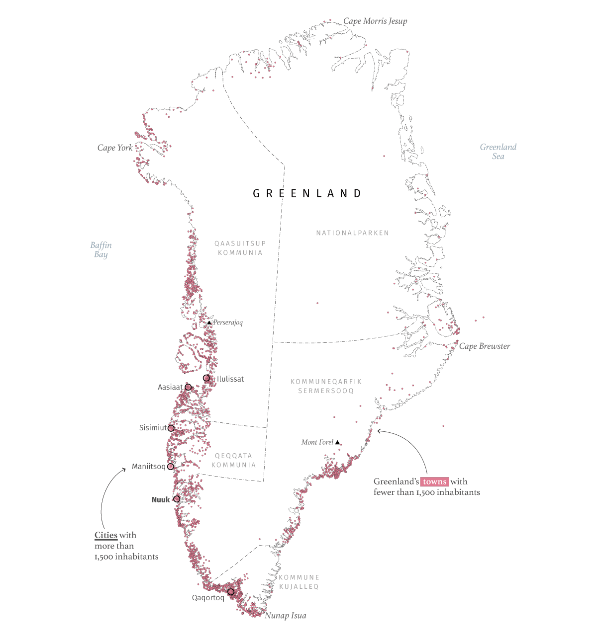 Having the middle of the territory completely covered by a shell of ice has, of course, determined where its inhabitants have settled. Greenland’s population is about 57,000(as of 2026), most of the people lives in coastal, ice-free areas. The capital, Nuuk, is home to nearly 20,000 of Greenlanders, but the island is full of tiny settlements of just a few residents as you can see in the map below. (data from OSM)